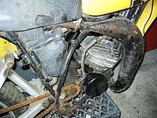 To give my YZ the Factory Works bike look, I stripped the paint off the cylinder, head, installed opaque number plates and gold rims. I installed 43mm forks from a 1982 YZ490, a longer swing-arm from a 1981 YZ125, foot-pegs from a late model YZ, throttle assembly from a 1992 YZ and a few other little tidbits. I cut off some metal from the frame, first the kickstand bracket (do you really need this on a racer?) and the bracket for the CDI that was mounted on the steering stem. I used the mounting bracket for the 1981 YZ125, which mounts the black box under the seat.