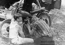 Hollingsworth was always popular with the kiddies. Here a local peasant child helps Nigel prepare the factory Ariel prior to his win in the ’61 GP del Grado. He later gave the poor lad his Fabiani shirt and Rolex Oyster as a sign of his appreciation. |