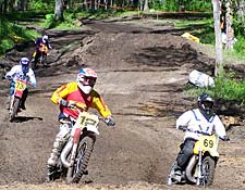 We rolled into Diamond Don’s just about 15 minutes after Andy had arrived so that was good timing. We jumped into Andy’s rental car and drove around looking for a place to park. Lots of the spaces were already taken but we found a large grassy section that faced the starting area of the track. We would have some of the best seats in the house, we though. Everything was wet as it could be. Standing water in several areas. Besides the area where we parked, most of the track was located in a wooded area. We walked the track and found that it was wider and faster than I pictured. Most was covered in new grass and there was about 3 man made jumps thrown in. Looked like fun. We saw Mark Eichorn, Darrin Tucker, Ron Kahan and Phil Ketchum plus lots of other familiar faces. I even see a gal with the sidecars and take an educated guess and introduce myself to Janette who hangs out on the Hodaka site. It was like a family reunion.