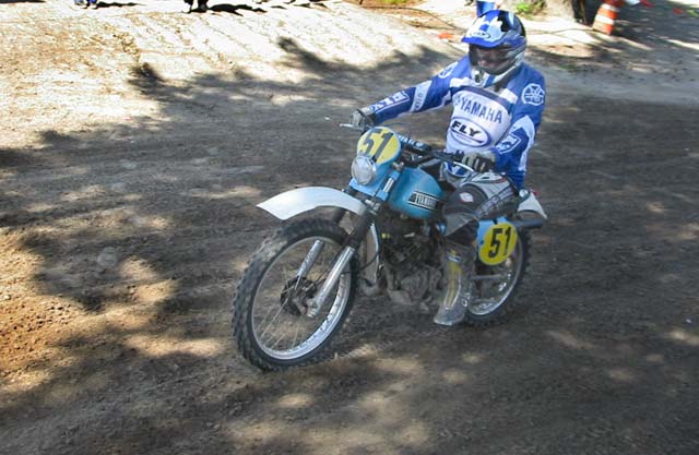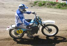 So comes my final moto of the day, the second 50+ Evo race and it is time to get a little serious. I know number 41 and number 454 have beaten me in the first moto so after a good, front of the pack start in FIRST gear this time AND with the goggles DOWN, I find myself feeling good and still taking a few chances but riding OK, I think. After a lap, I come up behind a 250 Honda Elsinore and there he is… number 454! He is riding well and so I follow him for a lap studying his line and notice he takes the sweepers fairly wide. I’m hot on his tail and we’re dicing but there are only two or three places to pass on the whole track and his 250 always has the power to shut the door on me. The white flag lap is coming up and I can’t pass so I think, “Let’s have a little fun over the tunnel jump this time”. I take it about 5 MPH faster that I have before and launch into the air landing well down the hill just in time for the hairpin with the Elsinore a few bike lengths in front of me. Cool… White flag. One more try at him but he is just a bit faster than me in the straights. I catch him in the woods and come up behind him in the hairpins but he pulls me in the straights. Here comes the tunnel jump one last time, my last jump of the day and so I think, let’s HOT DOG!! It’s time! Launch high in the air again but this time with body english and a “Roger DeCoster cross-up” in mid air!! But hey… TOO MUCH SPEED and I over-shoot the hairpin finding myself in the soft berm stuff and in the wrong gear. BOG! [shift] BOG [shift] but then my rear wheel spins once again and throws a long roost. Two hairpins later, I finish 2nd place in the moto and my day is done for a second place overall in the 50+ Evo Amateur class. Wow!!