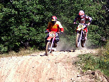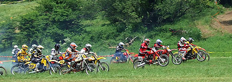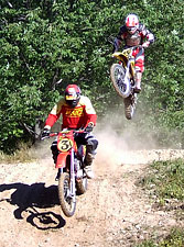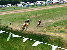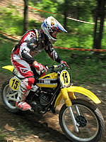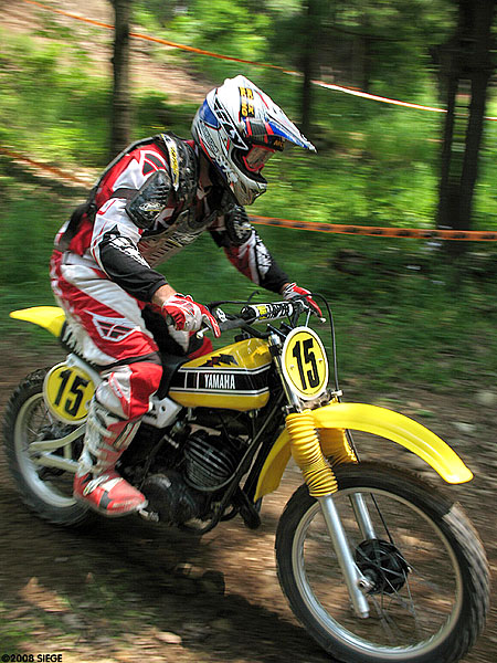 | Jesse McCrea #15 on our YZ250F stalking Expert Class rider Tom Shaeffer #3A on a Maico 490. These two wrangled all day with each winning their respective classes. Great Racing! |