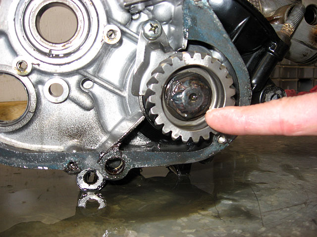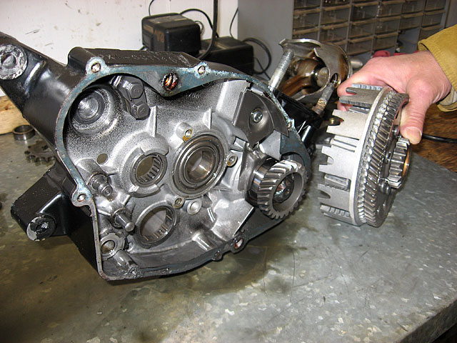 The crankshaft had a spun bearing. Plus the crankshaft drive gear retaining nut had stripped allowing the drive gear to walk out into the outer clutch basket. The drive gear retaining nut was then welded back into place.