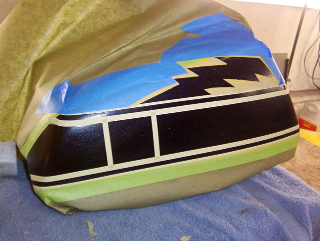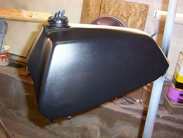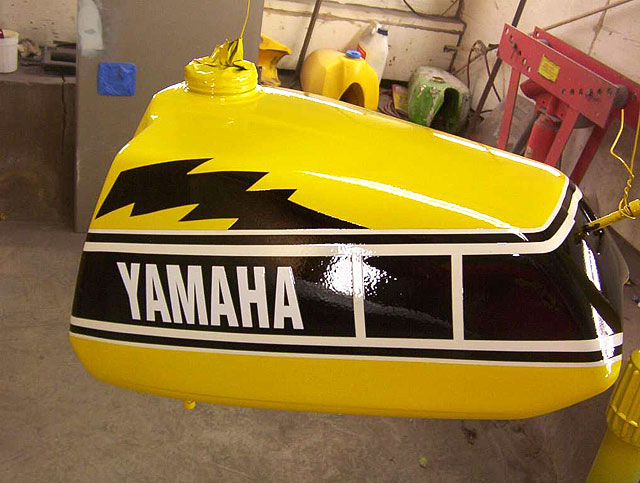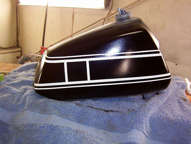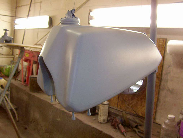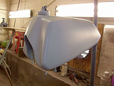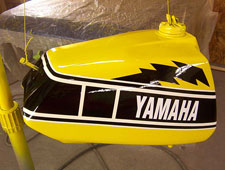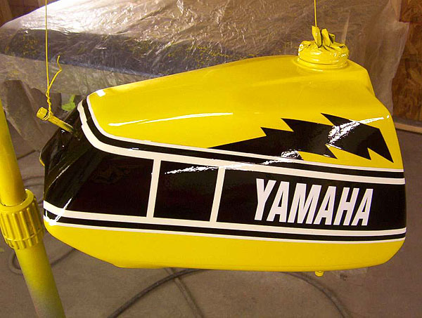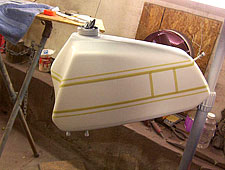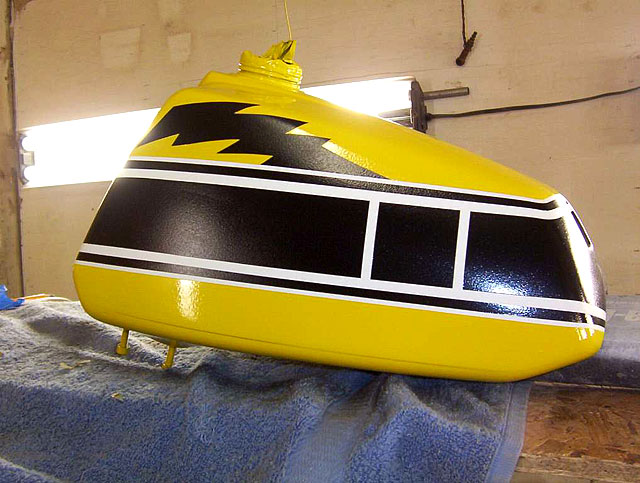 Through some trial and error a system of refinishing plastic gas tanks has been developed. Careful prep work and chemical selection has made it possible to have a more beautiful and durable finish than even a new tank. After finishing, color will not fade or change and stick on graphics will never bubble. The key to success when painting a plastic tank is to isolate the gasoline fumes. Fumes pass through the plastic and will quickly bubble paint or stickers. We use a flexible permanent inner liner that hold gas fumes and even alcohol fuel. All tanks are first thoroughly washed with acetone. After the inner liner is in the tank is sprayed with adhesion promoter, which is used for automobile flexible bumpers. Then it's coated with epoxy. Nicks and scratches can then be filled. A standard painting process follows with your desired color or design. Will it last forever? I don't know. My tanks have been done 2 years ago with no problems. They can always be redone at any time if damaged. Base cost for a tank is $300 plus shipping. Any color. This includes matching any plastic you have. Custom graphics are per hour @$45. I can then provide a paint formula for the frame so everything matches perfect if needed. The process takes about 30 days because some of the materials require a cure time. You must wait about 30 more days before applying stickers or adding fuel. Why restore an old tank? Some are not available and some originals have the manufacturer's logo and/or date codes that won't be on a repro. It also allows for personalized design and a higher quality look than dull plastic with stickers.